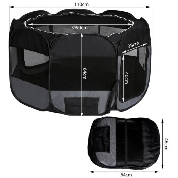Mit den Maßen Ø 110 cm und 64 cm Höhe und kleinen Details wie Seitentaschen zum Verstauen von Zubehör erhalten Sie einen fantastischen Tierlaufstall für zuhause und unterwegs.