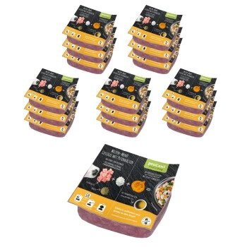 Das Welpenleben ist voller Abenteuer. Die kleinen Hunde toben, schmusen und entdecken die Welt. Unser Welpen-Menü hilft dabei, gesund ins Leben zu starten. Geflügelfleisch unterstützt mit seinem idealen Kalzium-Phosphor-Verhältnis den Knochenaufbau Ihres Nachwuchses. Das abgestimmte BARF-Menü versorgt ihn dabei mit allem, was er für eine komplette Mahlzeit braucht. Der im Frische-Menü enthaltene Kürbis soll mit seinen Kernen den Cholesterinspiegel positiv beeinflussen. Außerdem wird durch ihn die Bildung von Gallensäuren gemindert, welche für die Entstehung von Dickdarmkrebs mitverantwortlich sein sollen. Mit dem Premiumfutter betreiben Sie also ganz nebenbei Gesundheitsvorsorge für Deinen Hund.