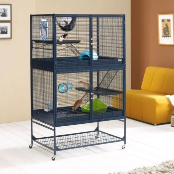 Der Käfig Royal Suite hat extra große Türen für einfaches Reinigen und Füttern sowie Stauraum für Futter, Streu etc. ausgestattet.